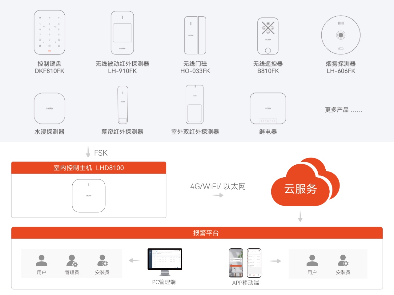 iHORN豪恩致力于打造“更安全、更穩(wěn)定、更靈活”的專業(yè)報(bào)警系統(tǒng),系統(tǒng)由報(bào)警主機(jī)、前端探測(cè)器、報(bào)警管理平臺(tái)組成。前端探測(cè)器一旦探測(cè)到異常情況,立即通過(guò)FSK通訊方式將數(shù)據(jù)上報(bào)至報(bào)警主機(jī),主機(jī)再通過(guò)4G/WiFi/以太網(wǎng)等方式通知云平臺(tái),現(xiàn)場(chǎng)聲光報(bào)警,并將報(bào)警信息通過(guò)PC管理端、電話、短信、APP等方式遠(yuǎn)程通知終端用戶,保障各類場(chǎng)所人員、財(cái)產(chǎn)、物品安全。