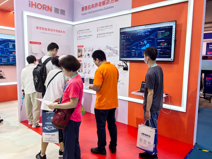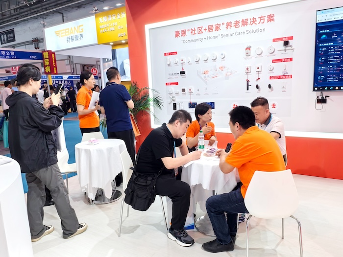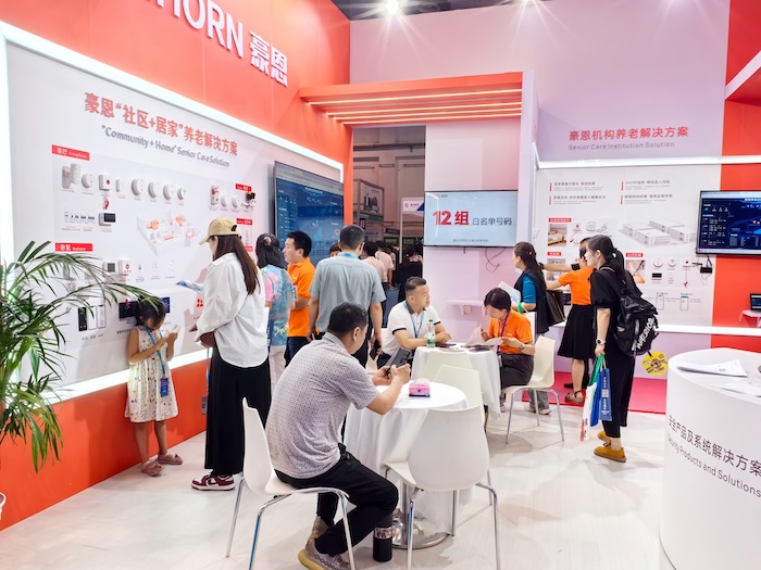 展會現場,豪恩全方位展示了居家安全防護系列、呼叫告警系列、定位穿戴系列、健康監護系列在“社區+居家養老”、“機構養老”等多領域的場景應用,吸引了眾多參展商和觀眾來展位體驗參觀。