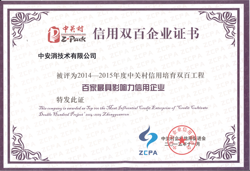 2015年11月17日,中關(guān)村企業(yè)信用促進會發(fā)布了“2015中關(guān)村信用雙百企業(yè)”獲獎名單,中安消技術(shù)有限公司憑借多年積累的社會信任度以及對中關(guān)村科技、經(jīng)濟的貢獻,再獲 “2015年中關(guān)村信用雙百企業(yè)——最具影響力企業(yè)”稱號。