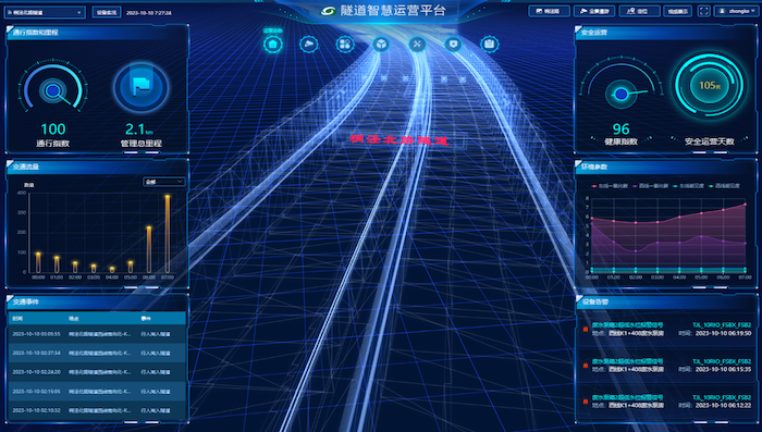 本系統采用人工智能技術,將實體隧道與虛擬模型進行映射和交互,系統通過多維智能感知技術,利用各類傳感器和監測設備,對隧道內外的多維信息進行感知和采集,以實現對隧道環境、交通流量、安全狀況、結構監測等多個方面的全面感知;系統采用數字孿生技術,對隧道進行數字化建模,以更加真實、直觀的方式呈現形狀和結構,以及隧道的狀態和運行情況。依托大數據分析技術,系統以任務管理為導向,貫穿整個生命周期,對設備、信息、人員、工單等進行跟蹤管理,有效提升管養效率;通過人工智能數據驅動模型,將隧道運行狀態的數據和模型結合起來,提供隧道管理和運營決策支持,為隧道運營管理的智能化、精細化、可視化及全生命周期管理提供了解決方案,極大地提升了隧道綜合管理效率和應急事件處置能力。