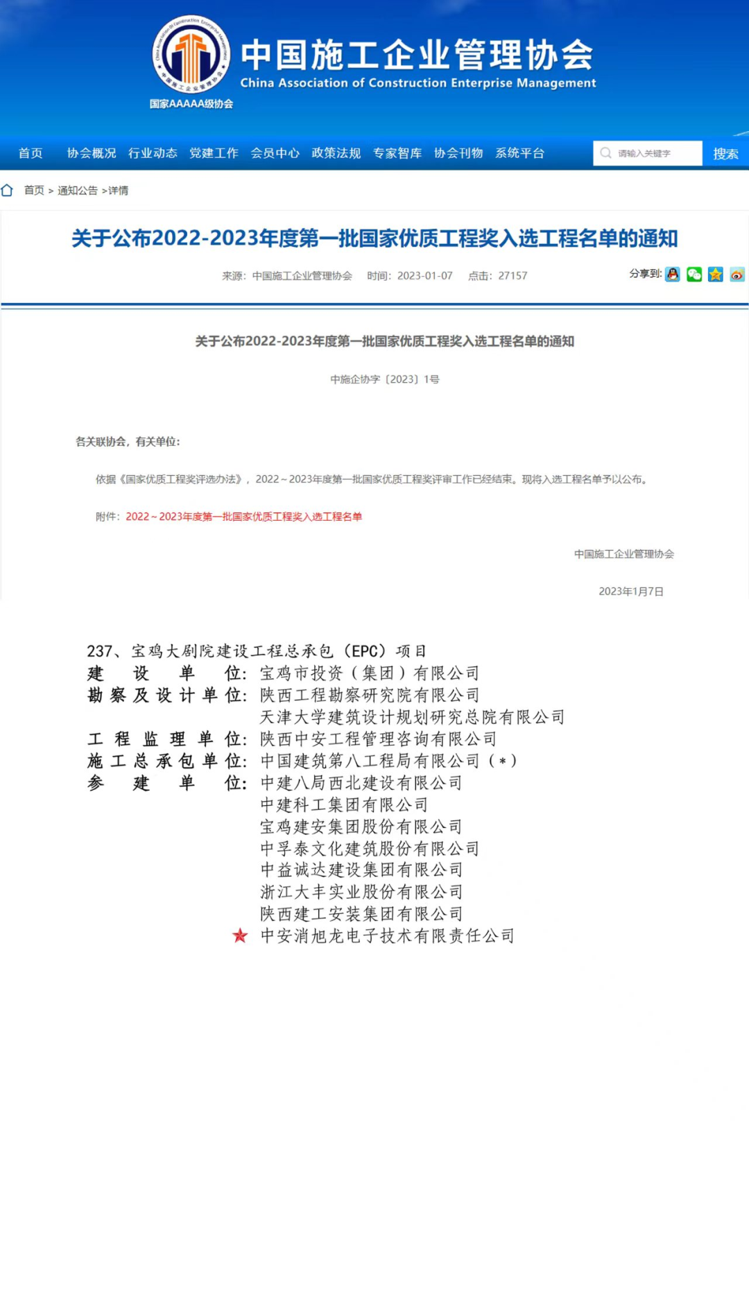 2022-2023年度國(guó)家優(yōu)質(zhì)工程獎(jiǎng)獲獎(jiǎng)名單新鮮出爐,中安消旭龍電子技術(shù)有限責(zé)任公司參建的寶雞大劇院建設(shè)工程總承包(EPC)項(xiàng)目榮獲國(guó)家優(yōu)質(zhì)工程獎(jiǎng)。