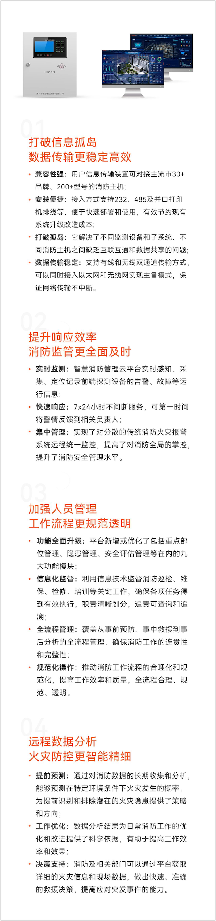 豪恩致力于無線技術與物聯網平臺的研發與應用,以部署簡單、功耗低、維護便捷的硬件,和數據清晰可視、功能強大的云管理平臺軟件,串聯各個消防子系統,打破地理限制,為完善的智慧消防解決方案奠定堅實的基礎。